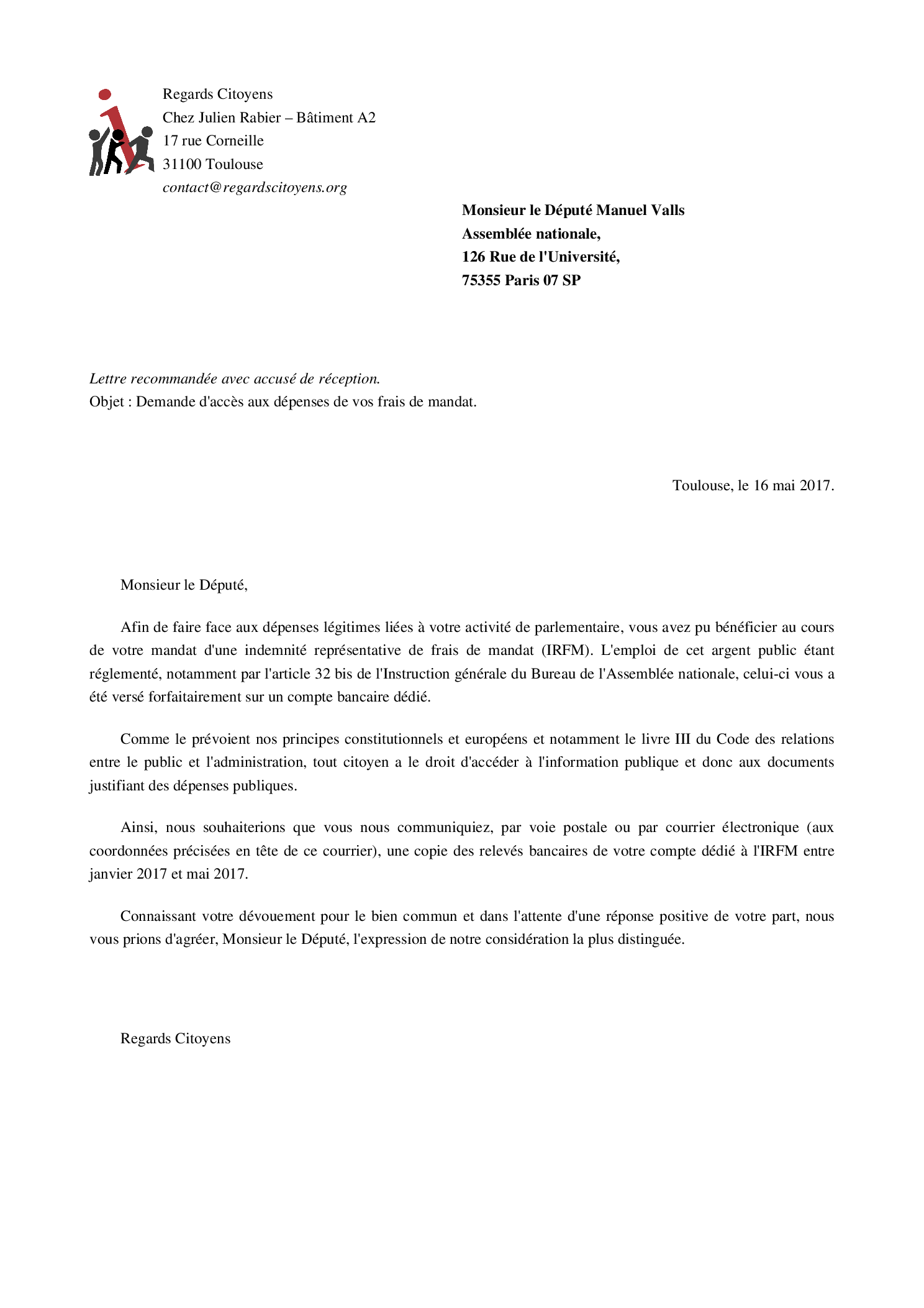 Interpeler le parlementaire sur la transparence de ses frais de mandatVous pouvez contacter directement le parlementaire ou l'un de ses collaborateurs pour recueillir son avis sur cette opération, et tenter de le convaincre de nous répondre favorablement.