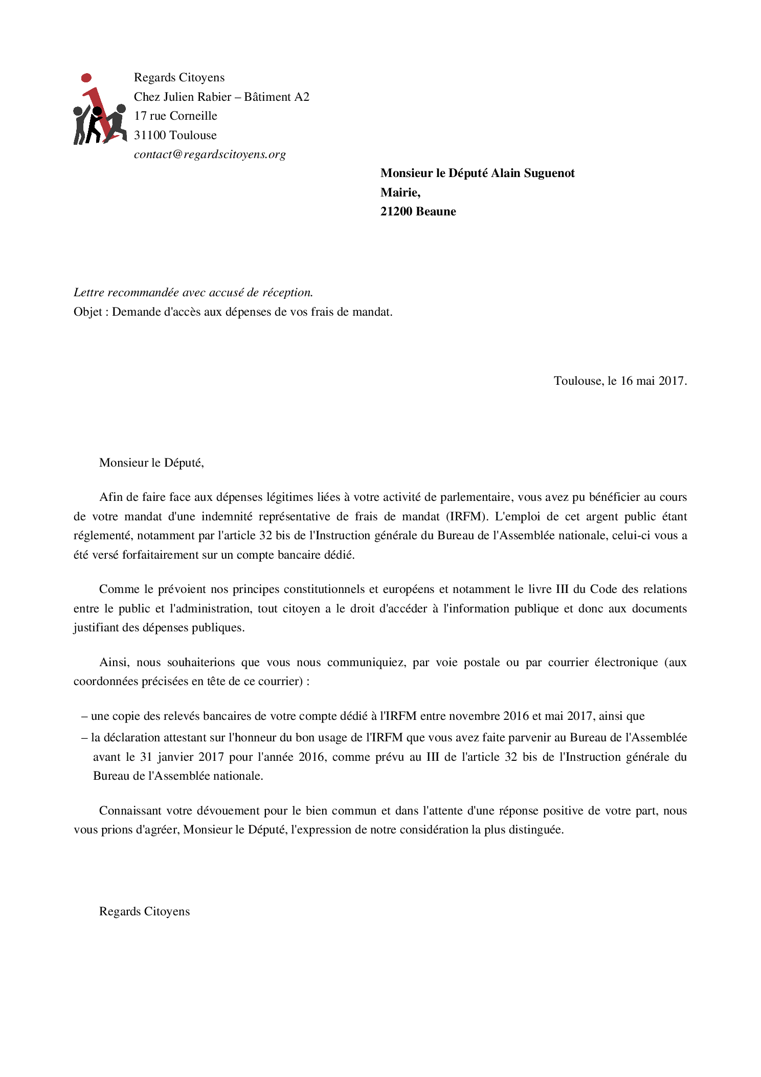 Interpeler le parlementaire sur la transparence de ses frais de mandatVous pouvez contacter directement le parlementaire ou l'un de ses collaborateurs pour recueillir son avis sur cette opération, et tenter de le convaincre de nous répondre favorablement.