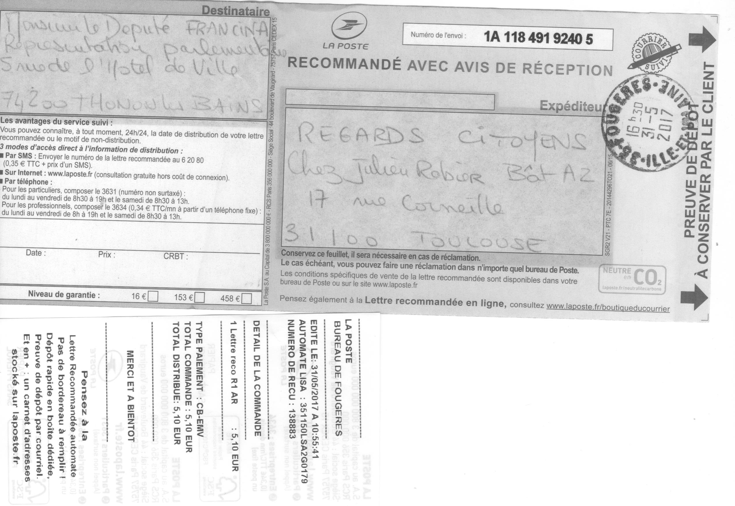 | Pris en charge | Cathyfelger | mer. 31 mai 2017 10:36:00 | Télécharger le courrier (PDF) PNG | |