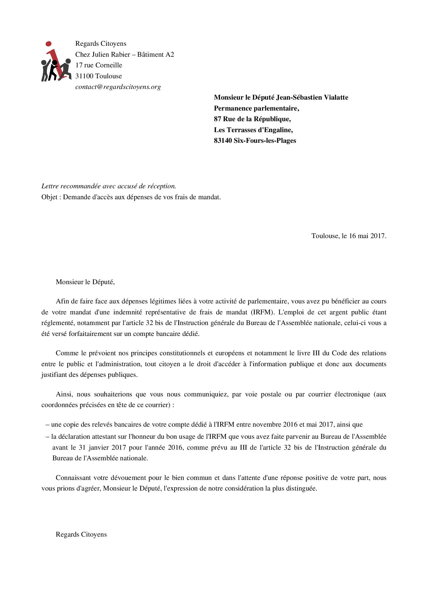 Interpeler le parlementaire sur la transparence de ses frais de mandatVous pouvez contacter directement le parlementaire ou l'un de ses collaborateurs pour recueillir son avis sur cette opération, et tenter de le convaincre de nous répondre favorablement.