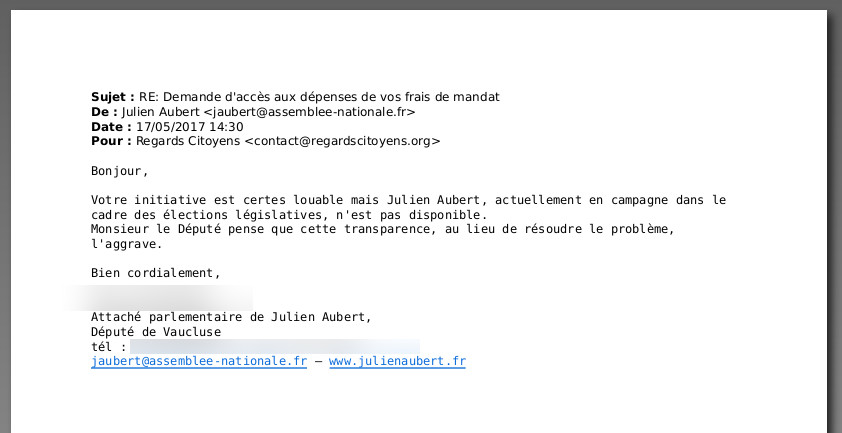 Interpeler le parlementaire sur la transparence de ses frais de mandatVous pouvez contacter directement le parlementaire ou l'un de ses collaborateurs pour recueillir son avis sur cette opération, et tenter de le convaincre de nous répondre favorablement.