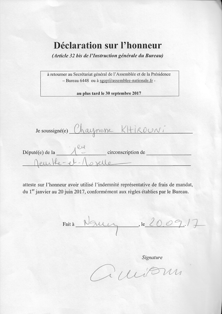 La déclaration sur l'honneur communiquée par la députée |