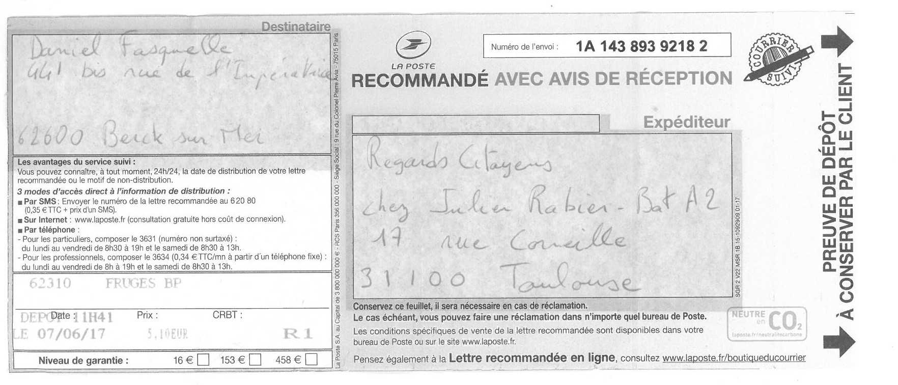| Pris en charge | PoluX | mar. 30 mai 2017 15:19:31 | Télécharger le courrier (PDF) PNG | |
