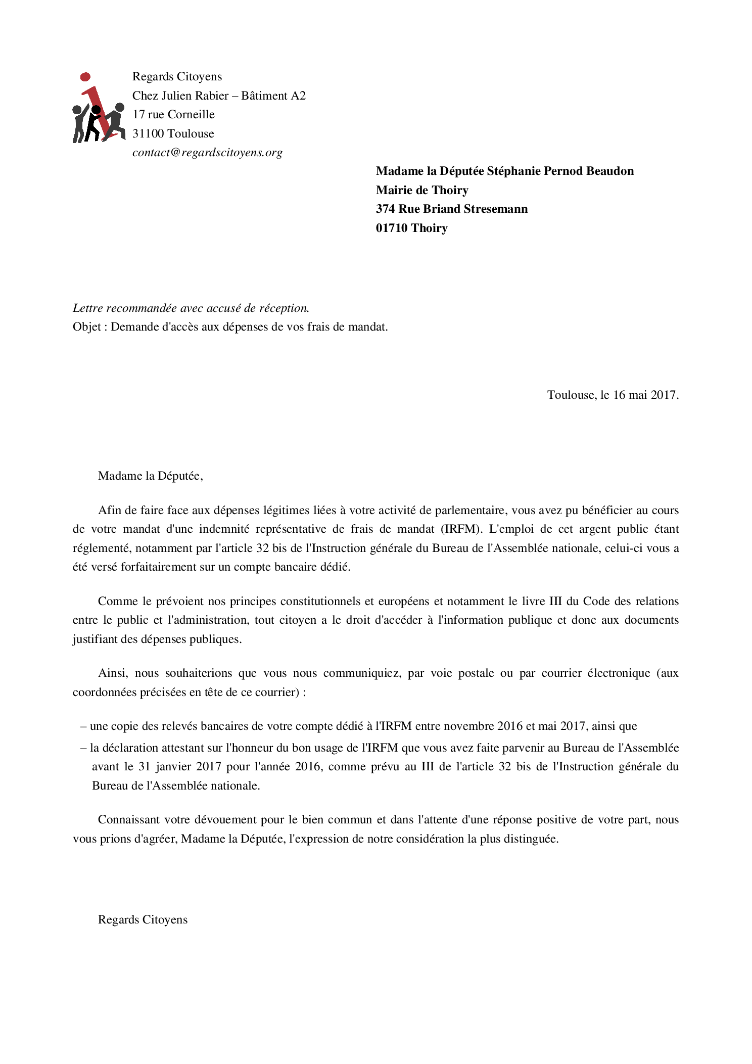 Interpeler le parlementaire sur la transparence de ses frais de mandatVous pouvez contacter directement le parlementaire ou l'un de ses collaborateurs pour recueillir son avis sur cette opération, et tenter de le convaincre de nous répondre favorablement.