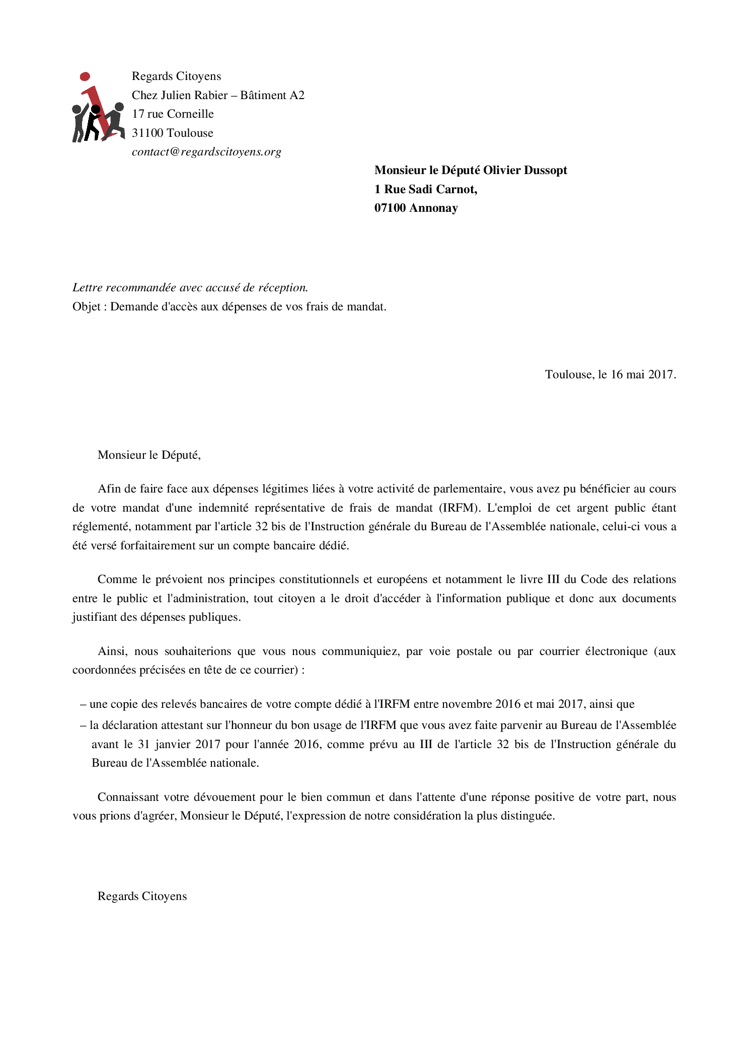Interpeler le parlementaire sur la transparence de ses frais de mandatVous pouvez contacter directement le parlementaire ou l'un de ses collaborateurs pour recueillir son avis sur cette opération, et tenter de le convaincre de nous répondre favorablement.