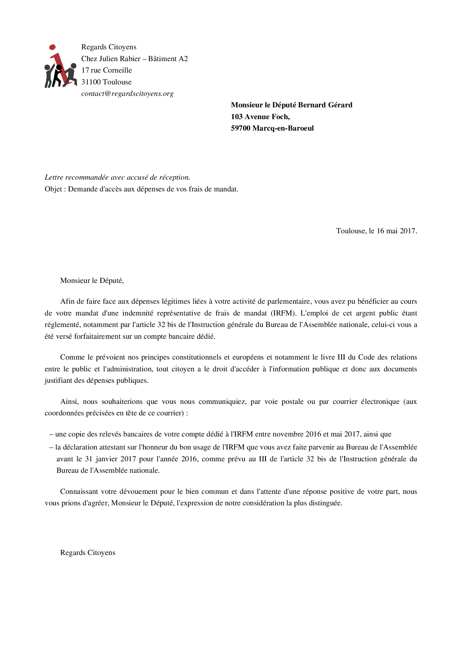 Interpeler le parlementaire sur la transparence de ses frais de mandatVous pouvez contacter directement le parlementaire ou l'un de ses collaborateurs pour recueillir son avis sur cette opération, et tenter de le convaincre de nous répondre favorablement.